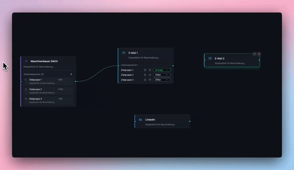 Unser Vorgehen basiert auf einem vierphasigen Ablauf: Kontaktbeschaffung → Anreichern & Profilen → Kontaktsequenzen-Planung → Vertriebsautomatisierung.