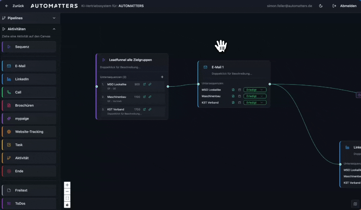 Unser KI-Vertriebssystem macht einen planbaren, progressiven Prozess: Markt verstehen → passende Firmen finden → die richtigen Entscheider identifizieren → automatisch ins CRM. Ohne Rätselraten. Ohne Excel-Chaos.